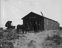 B 130 "Grant's Hospital; North Side 1909;" a tarpaper building. A man and boy stand in front, while another man sits in a buggy driven by two horses looks on.