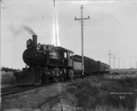 B 027 "R. R. Yards. Jerome, Idaho;" train with a 3-man crew; railroad track is lined with power poles