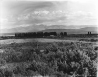 B 021 "Near Oakley;" looking across fields at a farmstead with poplar trees; Albion Mountains in background