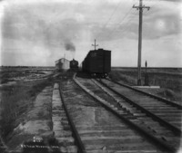 B 029 "First Passenger Train - Barrymore, Idaho. August 9, 1911;" a couple of men stand alongside the train as it sits on the railroad tracks, southeast of Jerome, Idaho.