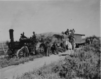 2000 "Sam Swanson's Thresher;" A group of men posing with steam engine thresher. Horses and wagons also seen.