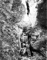 1962 A ladder propped against rocks in a crevice of a canyon wall, likely near Shoshone Falls.