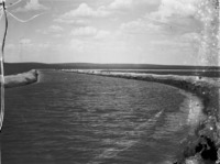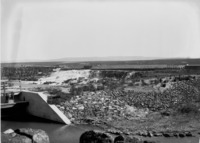 1877 Empty canal channel through rock, a construction tower or drilling rig in the distance.