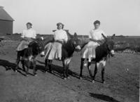 1867 Three young women, riding donkeys side-saddle in a barnyard.