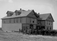 1870 Bickel School shortly after construction, with a large crowd of mostly children lined up in front.