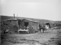 1868 A primitive house, with a buggy at the side; four people standing in front of the house and two in the buggy are posed eating watermelon.