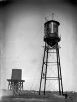 1858 Water towers (tanks) for Twin Falls; one man stands on the structure, with one man below. Townsite buildings visible in background.