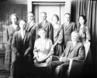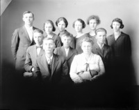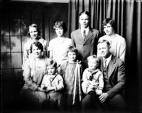 1855 Portrait of a family with one woman, one man, three young women, and four young men.