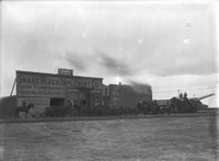 1864 View of several buildings, with wagons, men, horses, and other farm equipment lining the street.Sign above one building reads, "Gibson's Place; Snake River Implement Co. Ltd. Farm Furnishings Hardware and Harness, Wagons Buggies and Mowers Rakes and Binders."