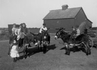 1865 Eight children on and by three donkeys in a barnyard; large barn in background.