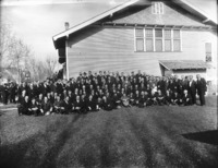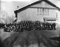 1820 Large group of men posed in front of the original First Christian Church. The Methodist Church can be see in the background at left.