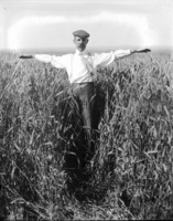 1829 Clarence Bisbee with arms outstretched in a field of chest-high grain.
