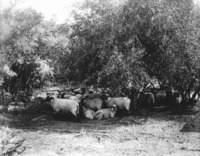 1648 Two boys stand amid a band of sheep; large poplar trees in background.