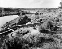 1650 A view of Milner Dam, with wooden irrigation flumes in the foreground.