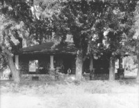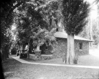 1645 House made of lava rock, in a grove of trees; family poses on porch.