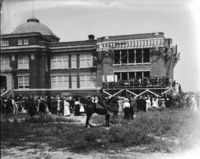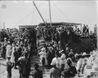 1564 A crowd of people listening to speaker on scaffolding of at Twin Falls High School during laying of the cornerstone for the new wing addition, July 4th 1912.