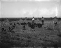 1576 A man and woman in a corn field surrounded by turkeys, at the F.E. Williams farm, 4 miles east of Buhl, Idaho; corn shocks in background