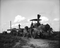 1565 Large steam tractor pulling four freight wagons, the tractor reads, "The Best Manufacturing Company; San Leandro, Ca; " Number 237. Five men are posed on or about the tractor, which is loaded with construction materials for the Salmon Dam.