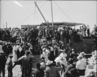 1570 Lincoln School. Laying the Cornerstone. June, 1908.; A large crowd of people among the construction elements at the school site, listening to a speaker