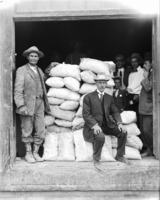 1569 Five men and a boy beside bags in a freight car; shipment is the first from a lease at the Jarbidge-Pavlak Mining Company, shipped through Brunn, Kinney Company..