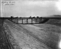 1568 "Highway Bridge, Main Canal;" three horse-drawn buggies and several people stand on a bridge above a dry canal.