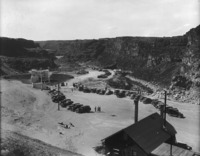 1525 Automobiles line the edge of the canyon at Twin Falls (waterfall) for the exhibition of Idaho Power's House of Today, a model home featuring new technologies that will become the home of the power plant's superintendent.