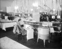 1523 A woman seated at an electric rotary iron inside a department store; other appliances displayed. A sign reads, "The following members of the Electric Equipment Sales Assn can supply you with complete home laundrey equipment: Detweiler Bros, Mountain States Implement Co, Sampson Music Co, Moon Paint and Furniture Co, Reeds's Riteway Store, Soden Electric, Claude Brown Co, Wilson-Bates Appliance Co, C.C. Anderson Co, Sweet's Furniture Store, Idaho Power Co. Any of these firms will gladly demonstrate washing and ironing equipment.