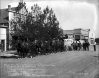 1531 "Record Crop White Clover Seed of the Twin Falls Tract and of the U.S. as Far as Known. 17 Bushels Per Acre - Value $21 Per Bushel. Yield $357 Per Acre. High Line Seed Farms; H.S. Green, President. E.V. Berg, Secretary; H.J. Hooker, Sales Agent;" three wagon loads of white clover seed in front of the Avant House on 2nd Ave E, pulled by four teams of horses. Sign on one wagon also states "275 1/2 Bushels; Clover, Idaho; from 16 1/5 Acres of Land;" Lavering Furniture and Lavering Theater on right; seven men stand by the wagons in the street, four men seated on front wagon.