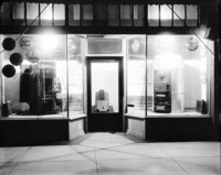1438 Two lighted display windows with women's clothing, hats, shoes.