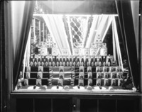 1436 A grocery store window display of canned and bottled food goods.