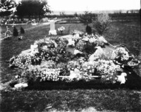 1432 A casket covered in flowers in a cemetery.