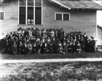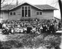 1425 Group of people, children and adults, posed outside the First Christian Church. {Other denominations that used the building included the Immanuel Lutheran Church, Grace Baptist Church, Gospel Temple Church, and Reformed Church,}