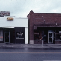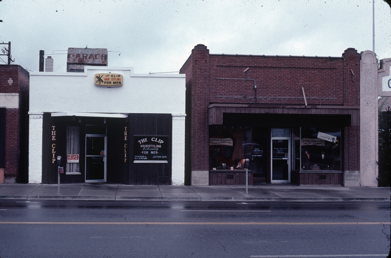 - View of The Clip Hair Styling for Men and Lasting Impressions Tuxedo Shop, along Shoshone Street N. The Twin Falls Chamber of Commerce is on the right, and the Log Tavern is on the left. A sign for "garage" is visible behind the buildings.