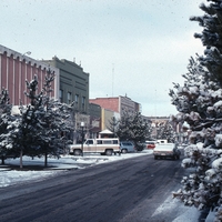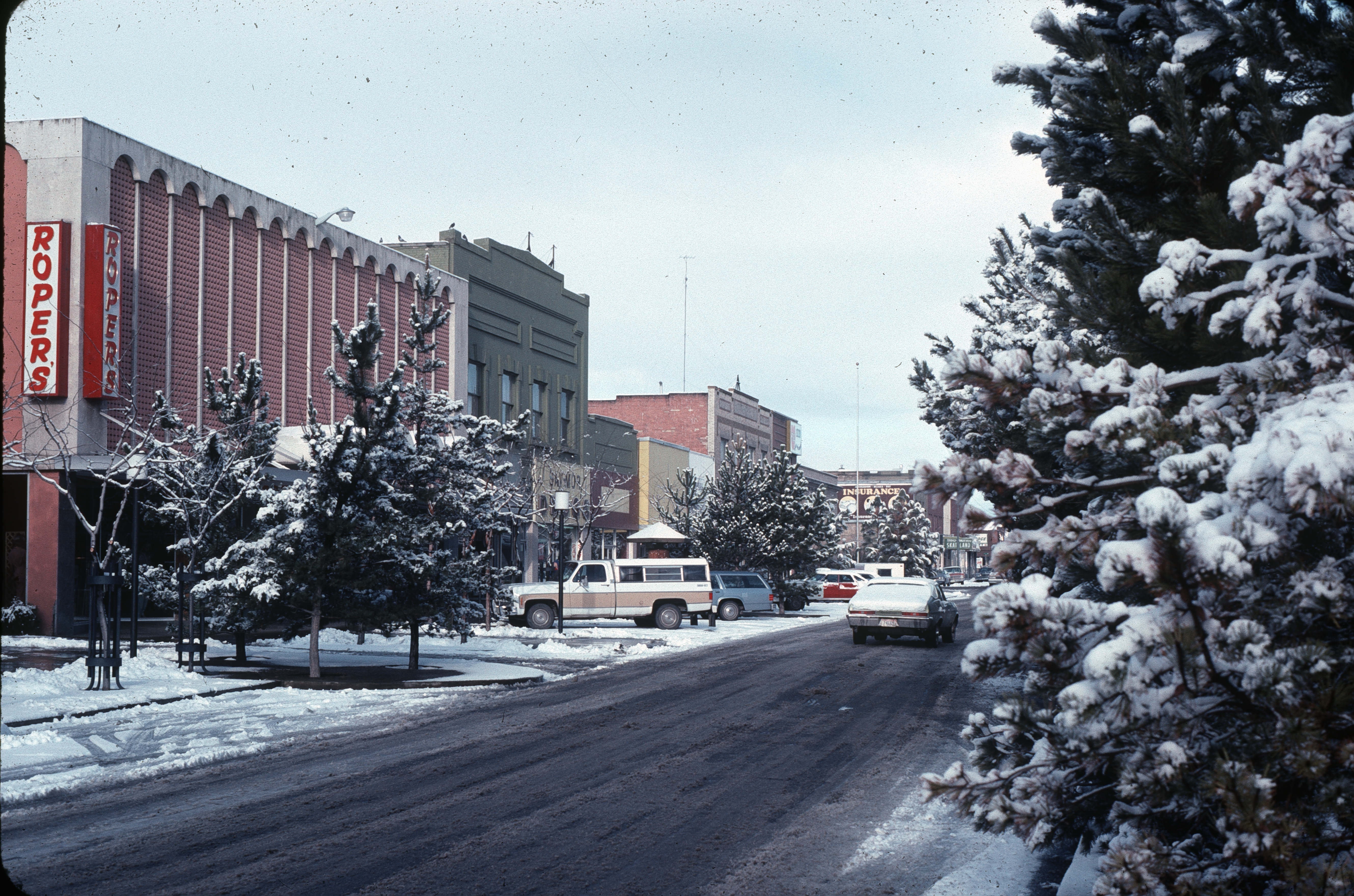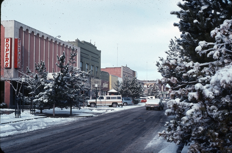 Storefront view of Main Avenue W during the winter. Roper's clothing Store and Sav-On Drugs are visible.