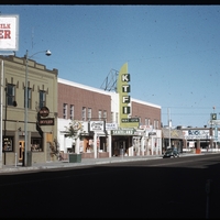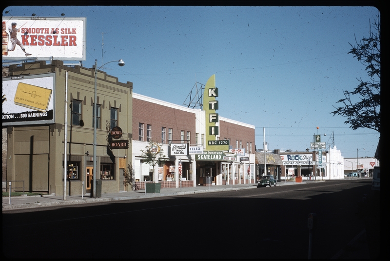 Storefront view along Main Avenue W, including The Bowl and Board (in the Gregg College building, KTFI Radio Rondevoo, Water Repair, Bonnie's Wig Salon, Telex Hearing Aid Service, Radio Rondevoo Skateland, G-G Novelty Gifts, Marie's Beauty Salon, Dutch's, Moon's Rock Shop, A sign for the Travel Lodge on 2nd Avenue W is visible. The white building is the Jenkins Chevrolet building and on the far right is the Sears building.