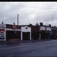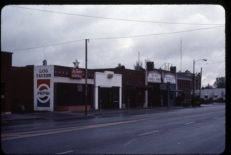 Storefronts of buildings on Shoshone Street N, including the Log Tavern, The Clip Hair Styling for Men, the Twin Falls Chamber of Commerce, and the Massachusetts Mutual Life Insurance Co. (Dennis Ward and Associates). The Twin Falls County Court House can be seen on the very right. An advertisement for Pepsi can be seen on the alley side of the Log Tavern building .