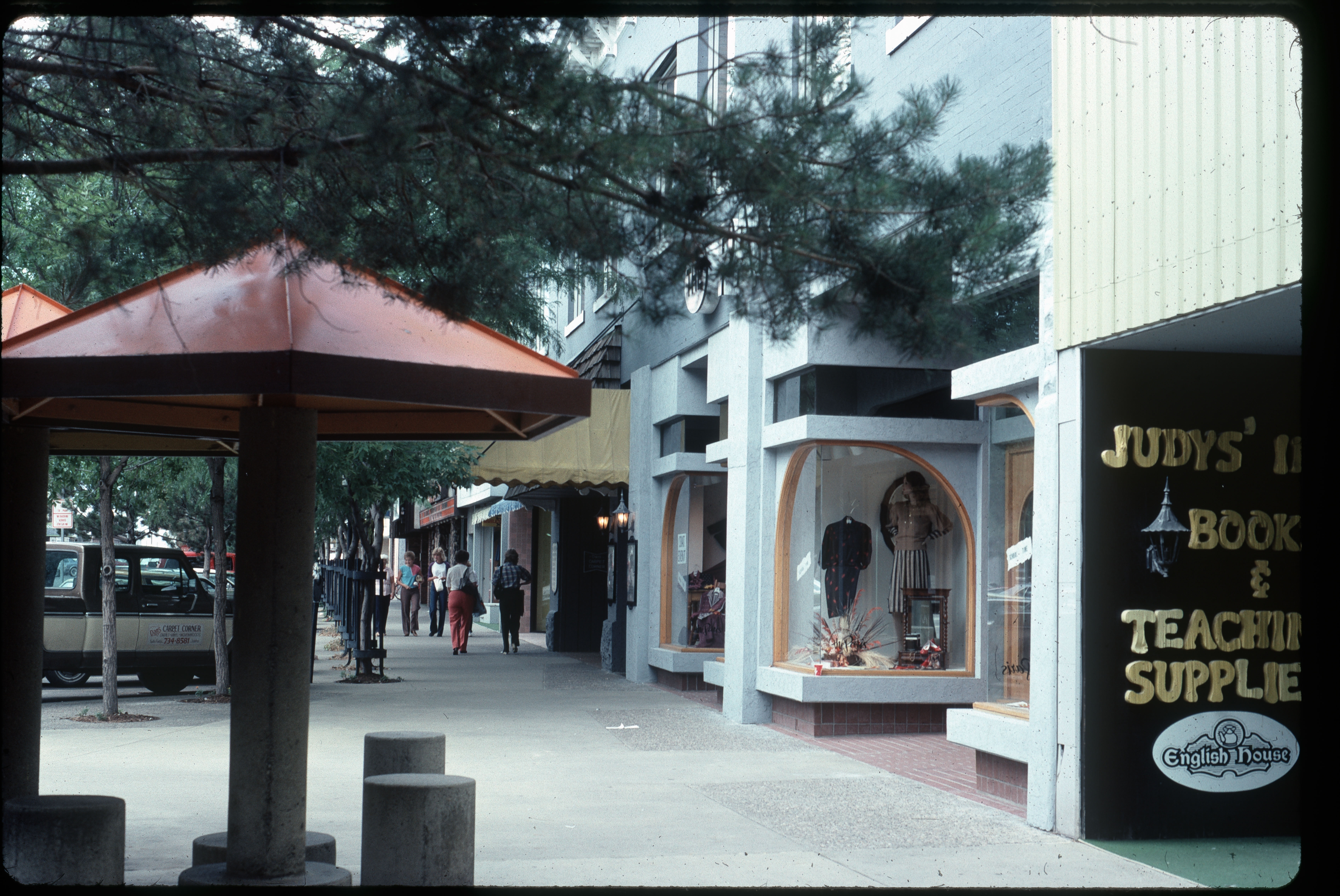 - View along the sidewalk of Main Avenue N after urban renewal. Judy's Books and The Paris are visible.