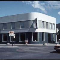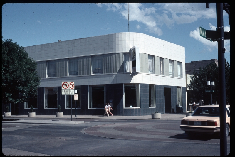 - Corner view of the Idaho First National Bank on Shoshone Street E and Main Avenue E, Jensen Jewelers is visible to the right of the bank.