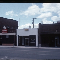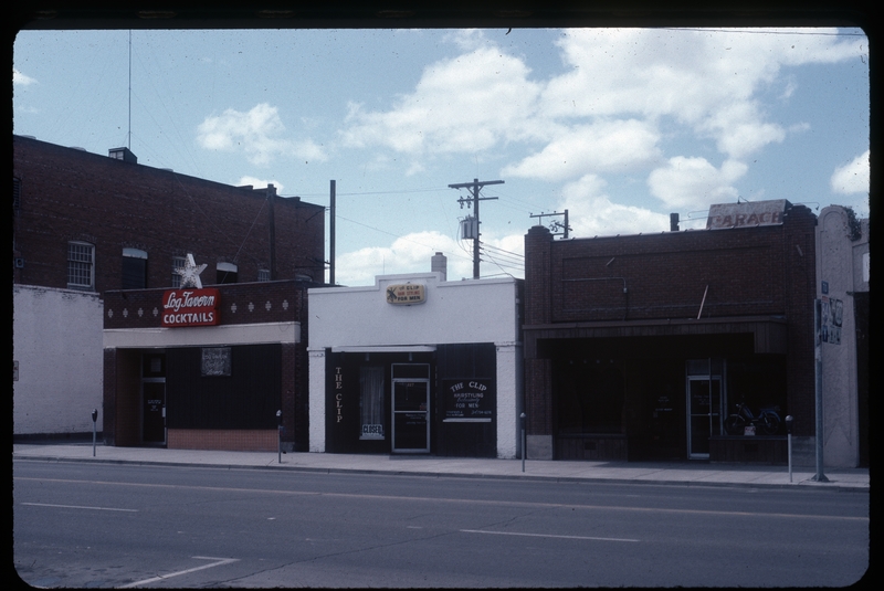 - Storefronts of Log Tavern Cocktails, The Clip Hair Styling for Men, and another building along Shoshone Street N. The alleyway at the side of the Log Tavern is also visible, as is the side of the Elks building.