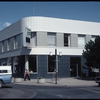 - Rounded corner façade of Idaho First National Bank; pedestrians, a biker, and a couple of automobiles are also seen. The building also housed Key Bank, and Twin Falls City offices (temporarily as City Hall was remodeled).