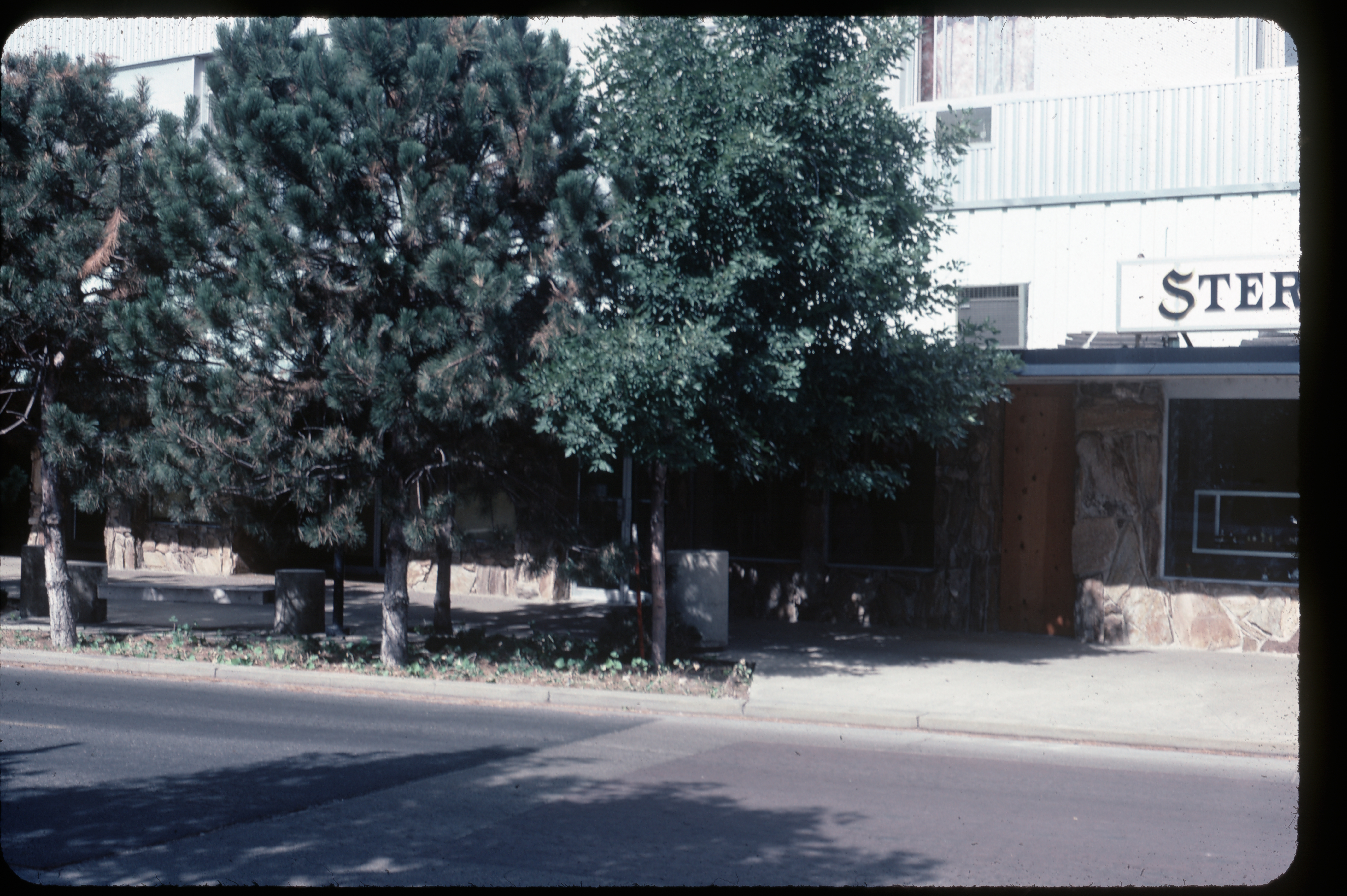 - Storefront of Sterling Jewelry, part of the Rogerson Hotel building, along Main Avenue. Trees from the urban renewal project flank the sidewalk.