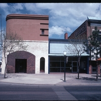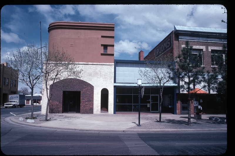 Rounded building on the corner of Main Avenue and 2nd Street N (now Gooding Street N). The building on the right with the word painted Rooms is the Koto Building. The corner building also housed the Boy Scouts at one time.
