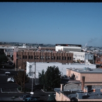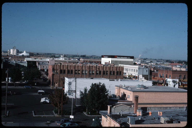- Aerial view of downtown Twin Falls, with a view towards 2nd Avenue E and Shoshone Street. Taken from the roof of the Mountain Bell building. First Interstate Bank is in the background; Burkholder building in center.