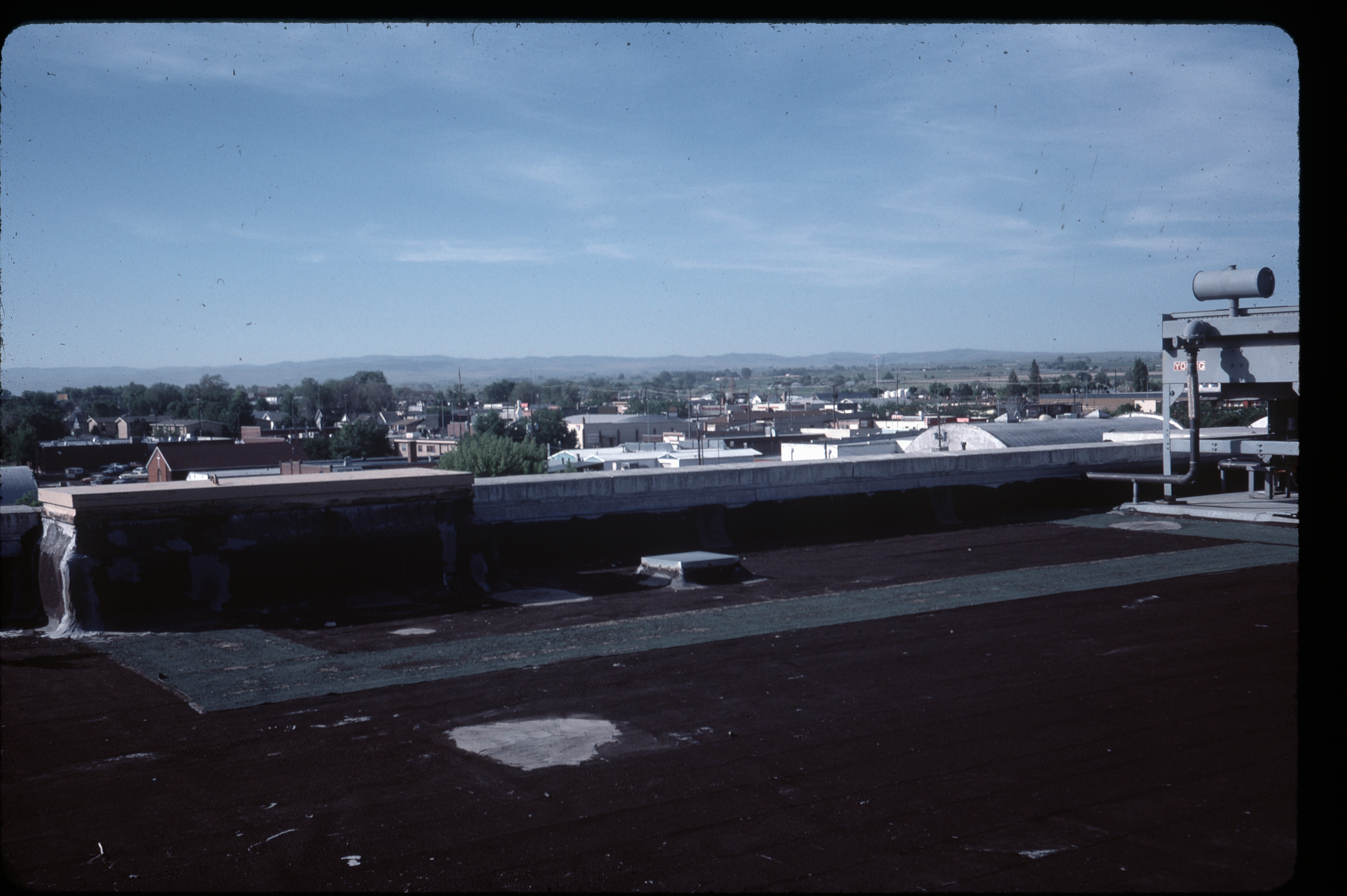- Aerial view from the Mountain Bell building looking east along 2nd Street E (now Hansen Street E) and 3rd Avenue E. Buildings visible include Blacker's Furniture, bowling alley (2nd Avenue E), and church on 3rd Avenue E and 4th Street E (now Jerome Street).