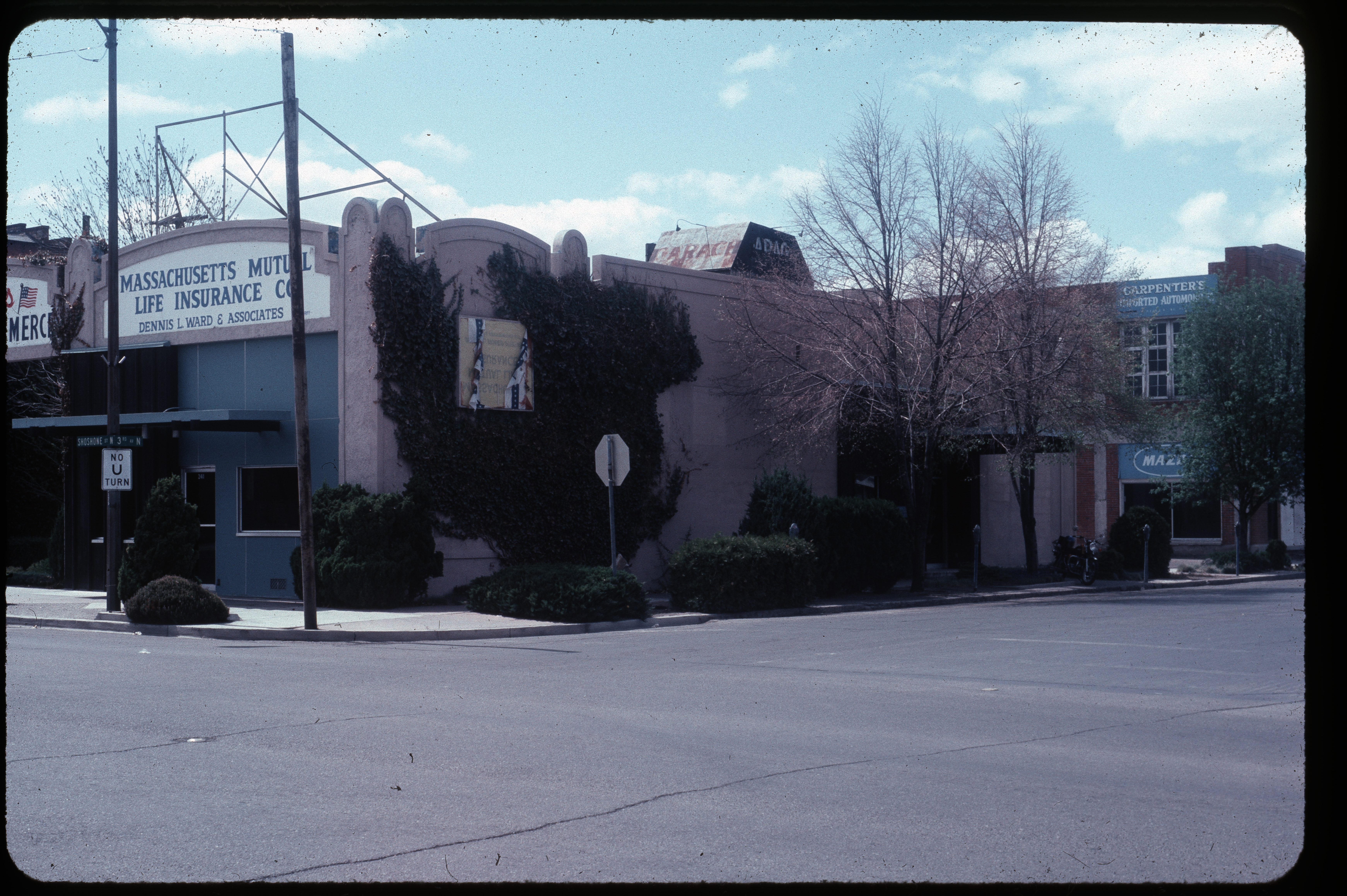 Corner view of the Massachusetts Mutual Life Insurance, Dennis L. Ward and Associates along 3rd Avenue N; also housed Berg Insurance. Chamber of Commerce is to the left. Carpenter's Imported Automobiles is seen at the very right behind the other buildings.