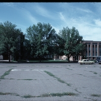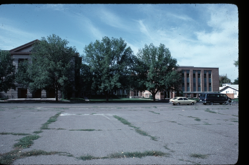 - View of the front of the Presbyterian Church from the parking lot across the Street. View shows the original church on the left and the additions on right.