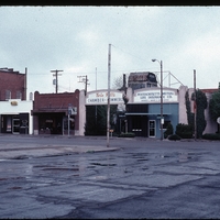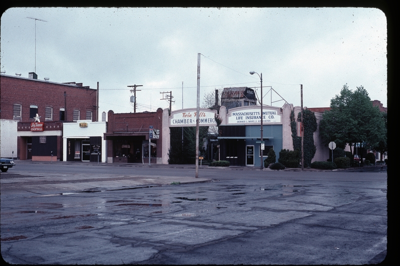Storefront view of buildings along Shoshone Street N, including Massachusetts Mutual Life Insurance Co., Dennis L. Ward and Associates; Twin Falls Chamber of Commerce, Lasting Impressions Tuxedo Shop, The Clip Hair Styling for Men, and the Log Tavern, as seen from 3rd Avenue E. Elks building on very left.