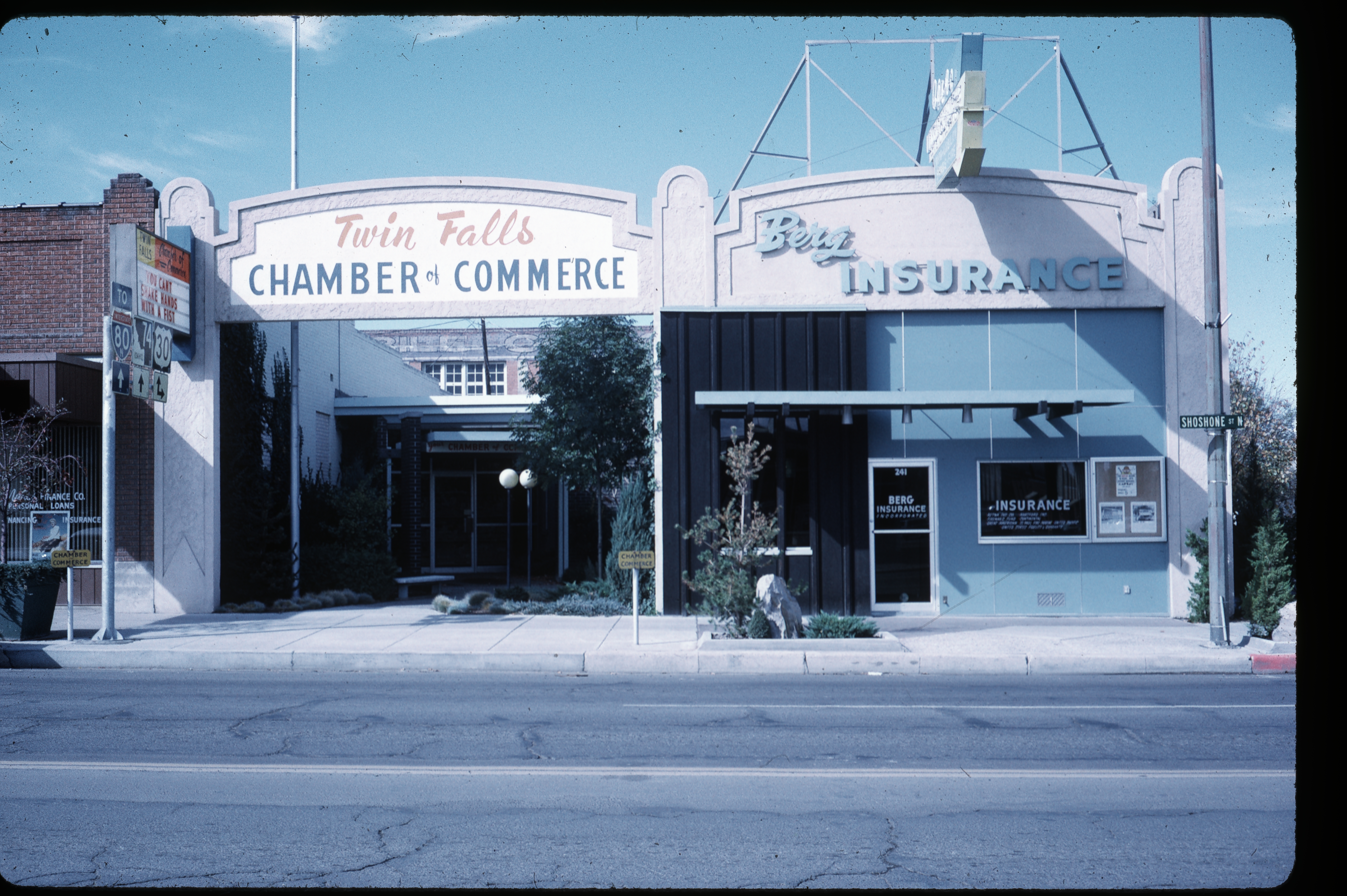Front view of Twin Falls Chamber of Commerce, which is set back from the Street with landscaping, and Berg Insurance