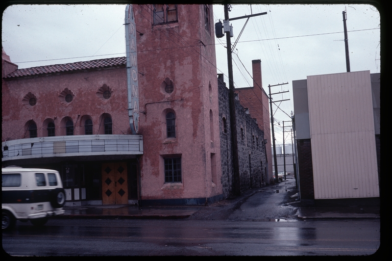 - Front view of the tower and marquee of the Ramona Theater in Buhl