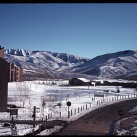 - View of mountains in Sun Valley, with slope-roofed townhouses at Elkhorn on left
